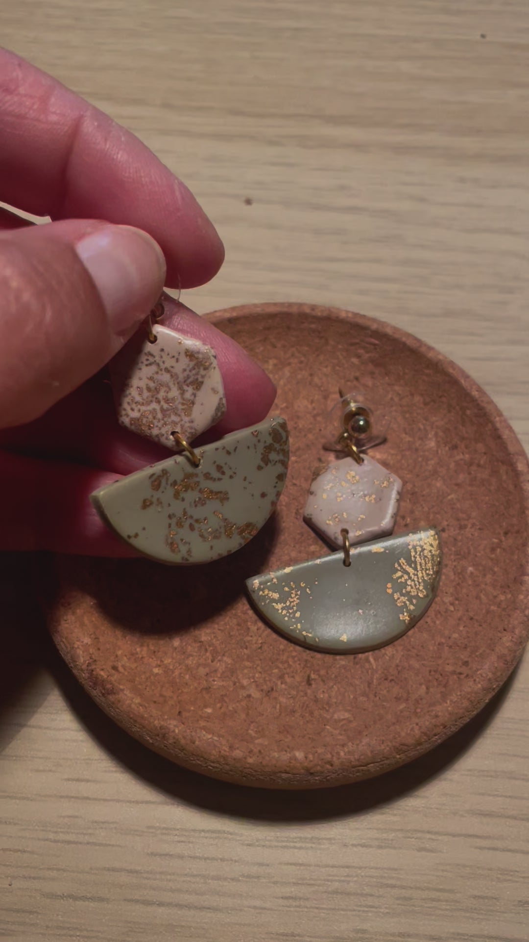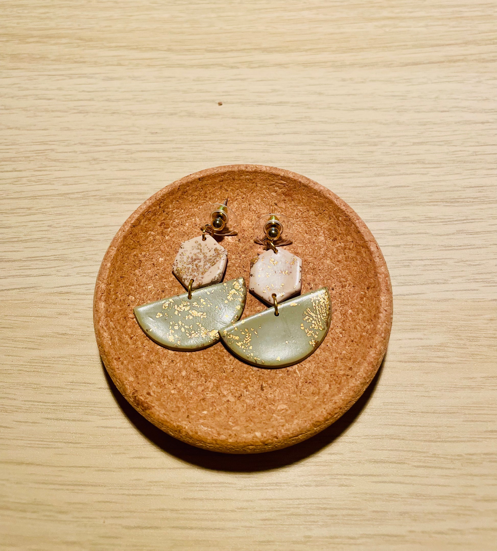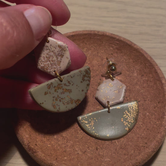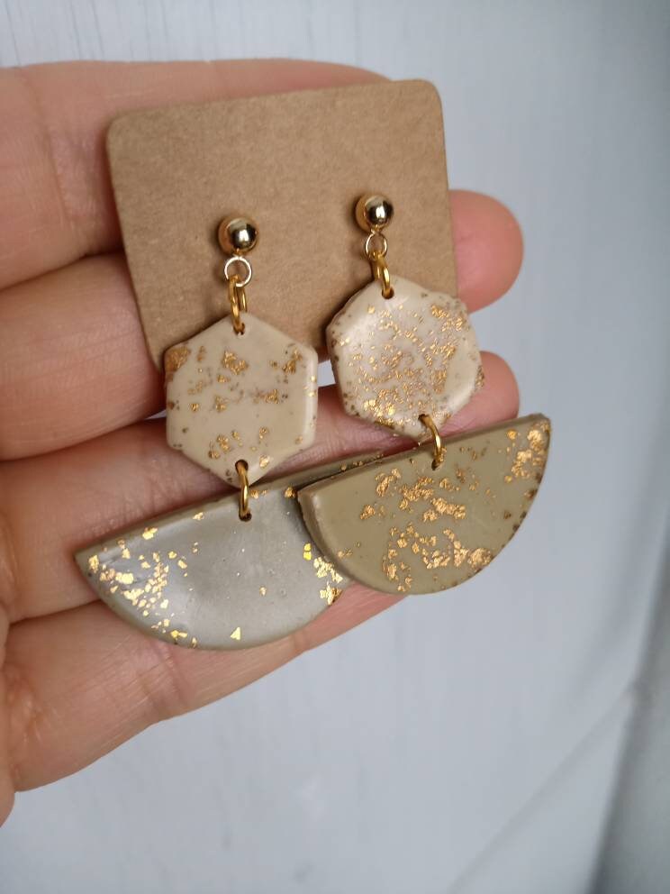 Fimo beige/helles olive grün mit Blattgold, Stecker aus Edelstahl goldfarben