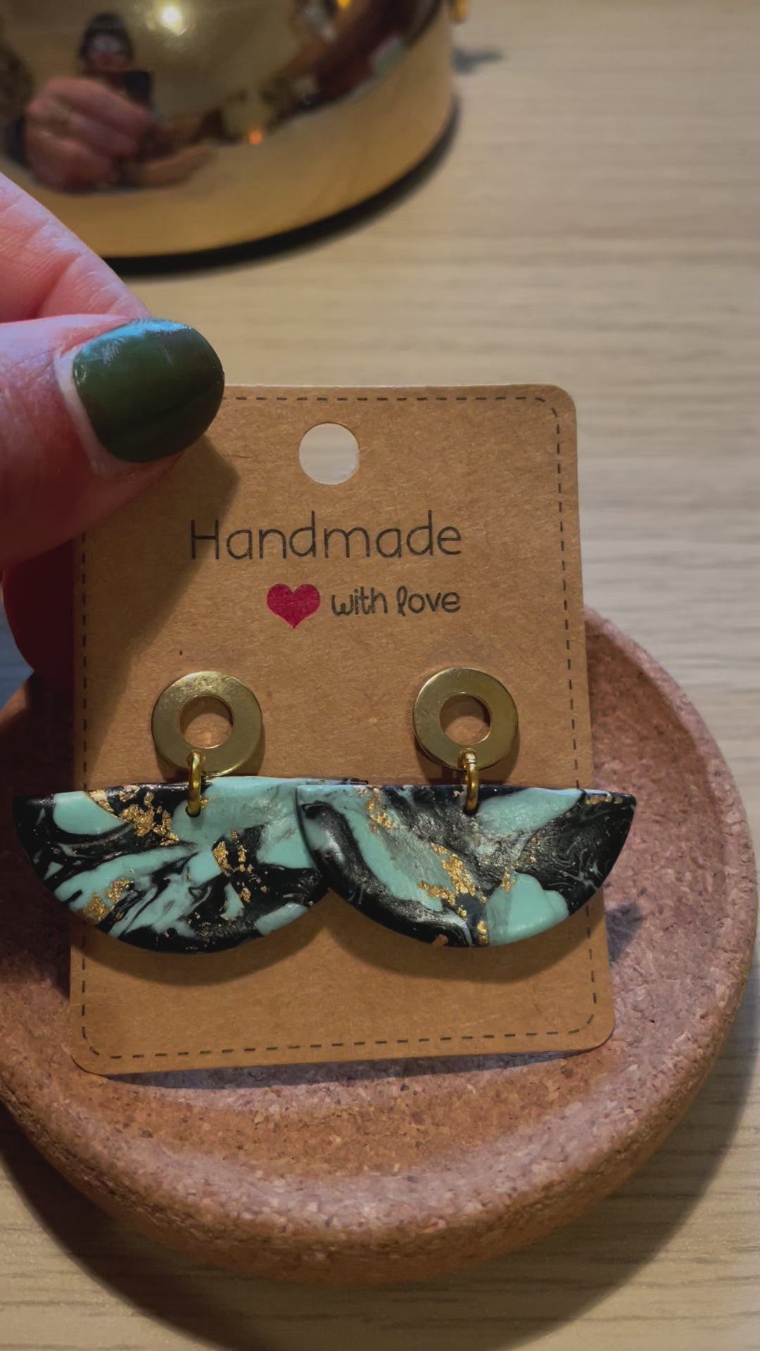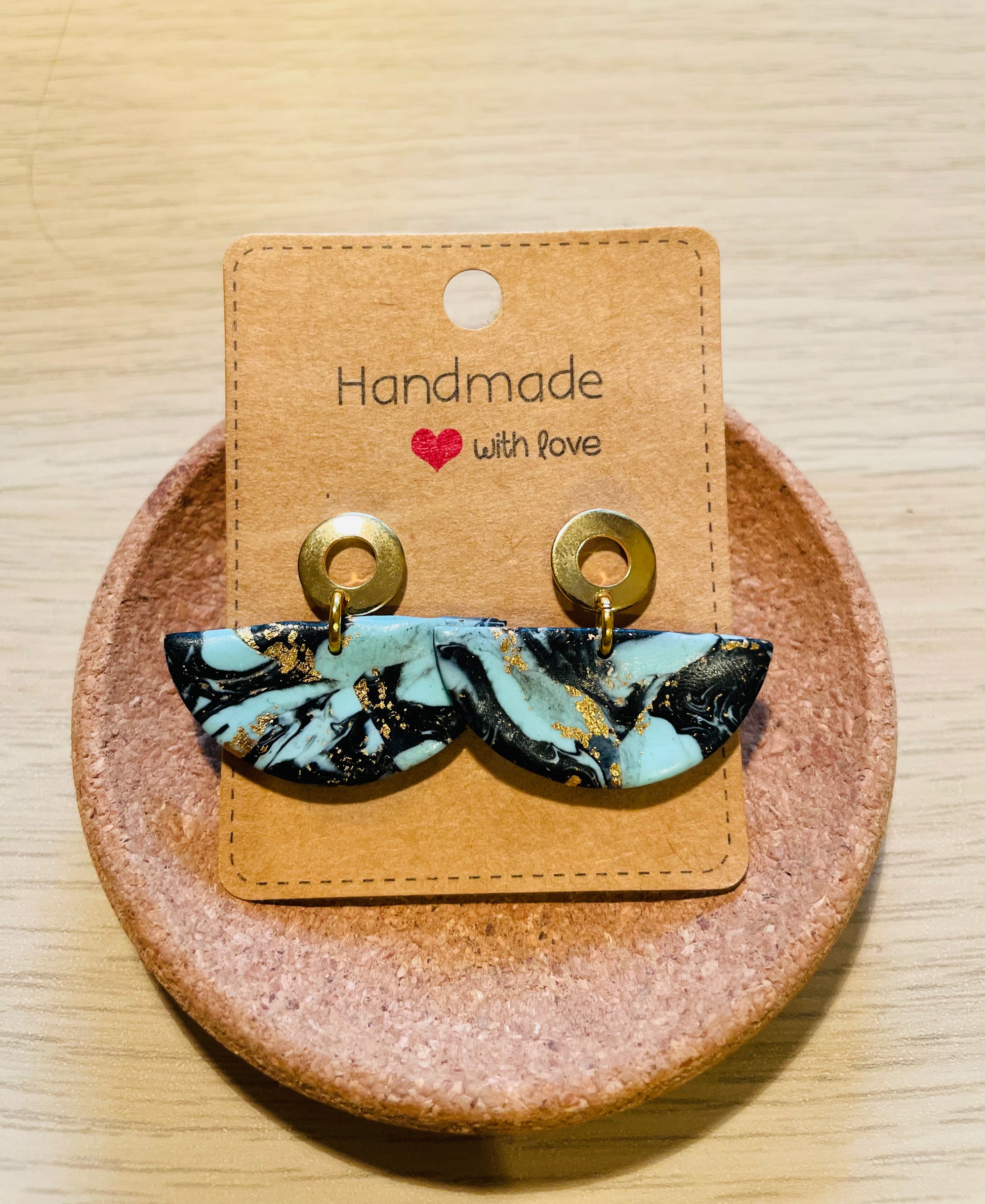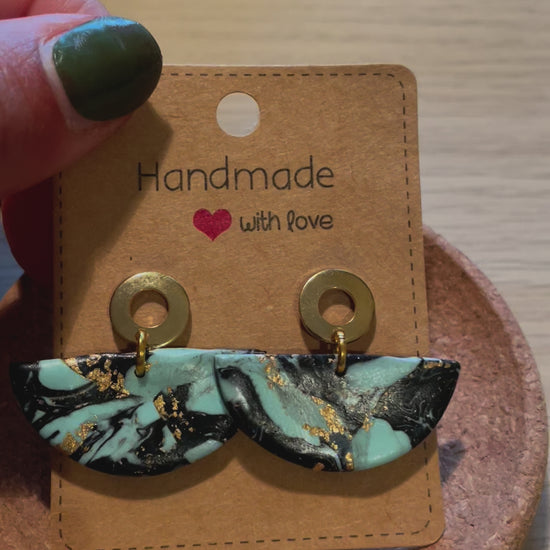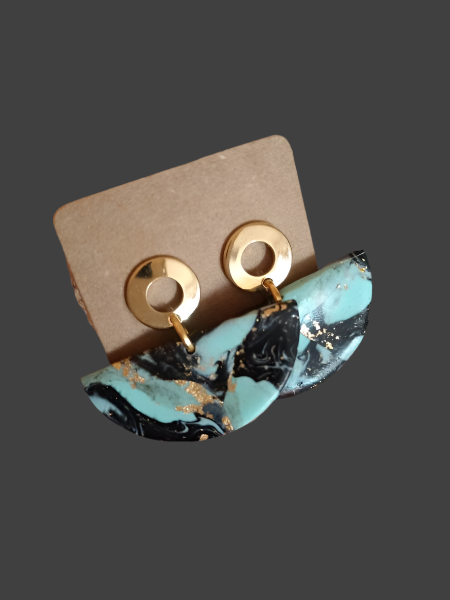 schwarz, türkis, balttgold, Fimo Ohrringe halbrund, Stecker aus Edelstahl goldfarben